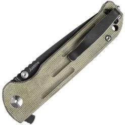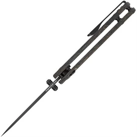 Model/Part Number – KI3605A2. Kizer Nebula Button Lock. 4″ (10.16cm) closed. 3″ (7.62cm) black stonewash finish CPM-20CV stainless blade. Gold carbon fiber handle. Thumb stud. Pocket clip. Black nylon pouch. Boxed. Made in China.