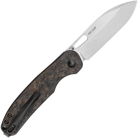 Model/Part Number – KI3606A1. Kizer Hic-Cup Button Lock. 4.13″ (10.49cm) closed. 3.13″ (7.95cm) stonewash finish S35VN stainless blade. Gold carbon fiber handle. Lanyard hole. Pocket clip. Extended tang. Thumb pull. Black nylon pouch. Boxed. Made in China.