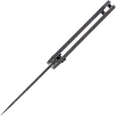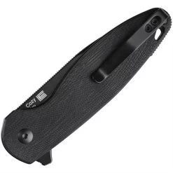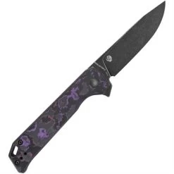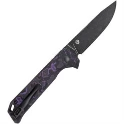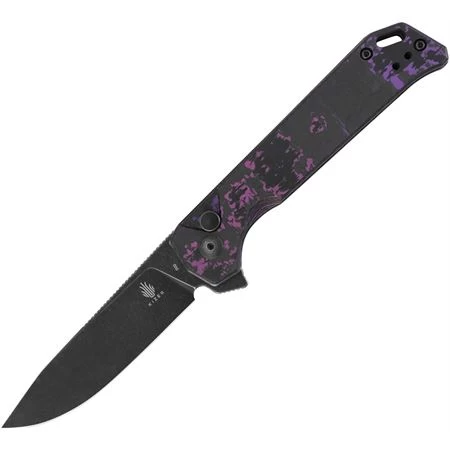 Model/Part Number – KI44582BA3. Kizer Begleiter 2 Button Lock CF. 4.5″ (11.43cm) closed. 3.63″ (9.22cm) black stonewash finish CPM-20CV stainless drop point blade. Black and purple carbon fiber handle. Extended tang. Lanyard hole. Pocket clip. Black nylon pouch. Boxed. Made in China.