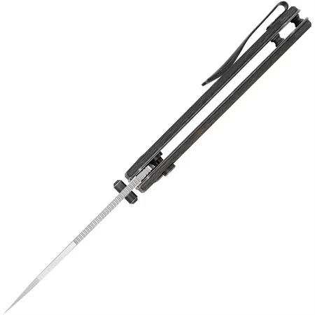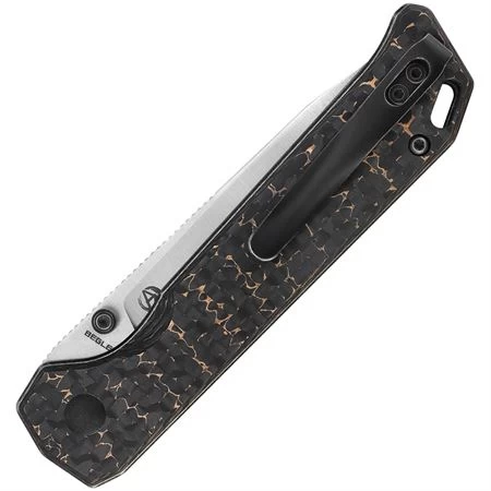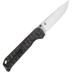 Model/Part Number – KI44582BA4. Kizer Begleiter 2 Button Lock. 4.5″ (11.43cm) closed. 3.63″ (9.22cm) satin finish CPM-20CV stainless blade. Thumb stud. Lanyard hole. Pocket clip. Snake skin gold carbon fiber handle. Black nylon pouch. Boxed. Made in China.