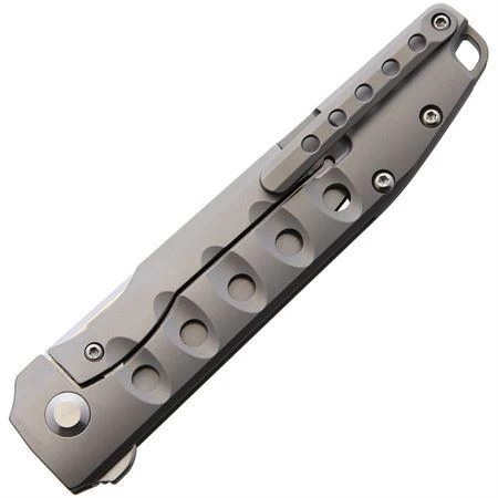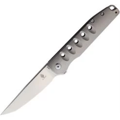 Model – KI4550A1. Kizer 4550A1 – Noble Framelock Knife. 4.38″ (11.13cm) closed. 3.5″ (8.89cm) satin finish S35VN stainless tanto blade. Gray titanium handle. Extended tang. Lanyard hole. Pocket clip. Black nylon pouch. Boxed. Made in China.