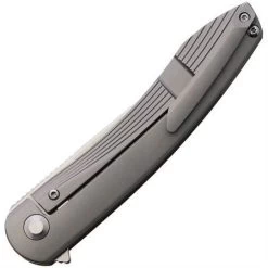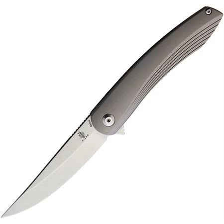 Model – KI4553. Kizer 4553 – Zen Framelock Knife. 4.25″ (10.8cm) closed. 3.25″ (8.26cm) stonewash finish S35VN stainless blade. Satin finish titanium handle. Extended tang. Pocket clip. Black nylon pouch. Boxed. Made in China.