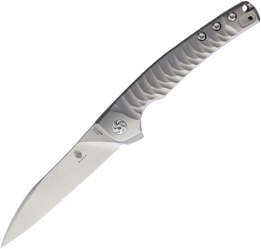 The silver sculpted titanium handle of the Kizer Cutlery Splinter Framelock is not only visually striking but also provides a secure and comfortable grip. The extended tang enhances the overall balance and control, allowing for precise and effortless handling.