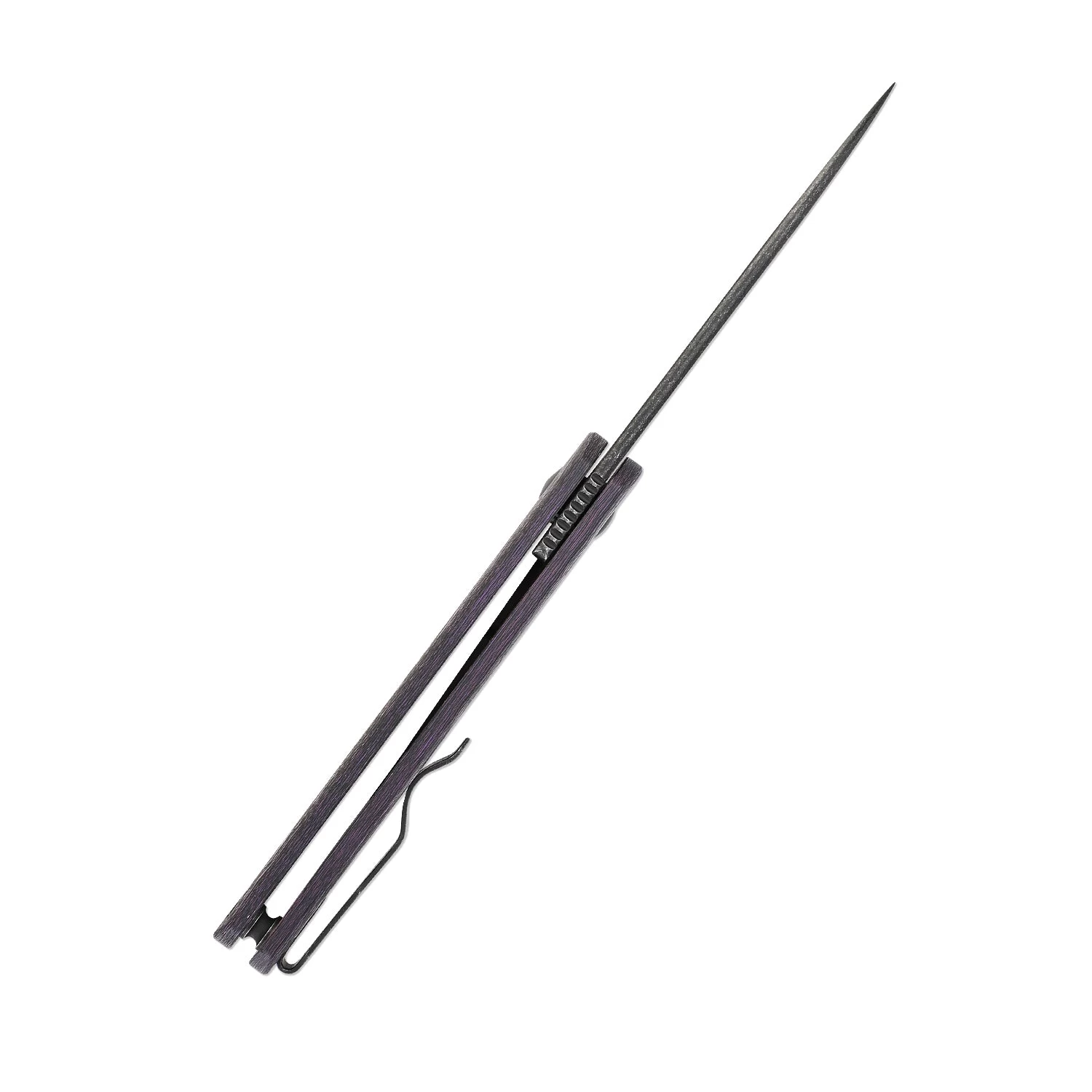 It utilizes 20CV steel blade and Fatcarbon handle. 20CV steel is a very hard steel with great wear resistance and it is easy to sharpen. The 20CV steel blade is strong and holds an edge well enough to make continuous cuts and slices. The unique purple patterns on the handle give the knife a fashion look.