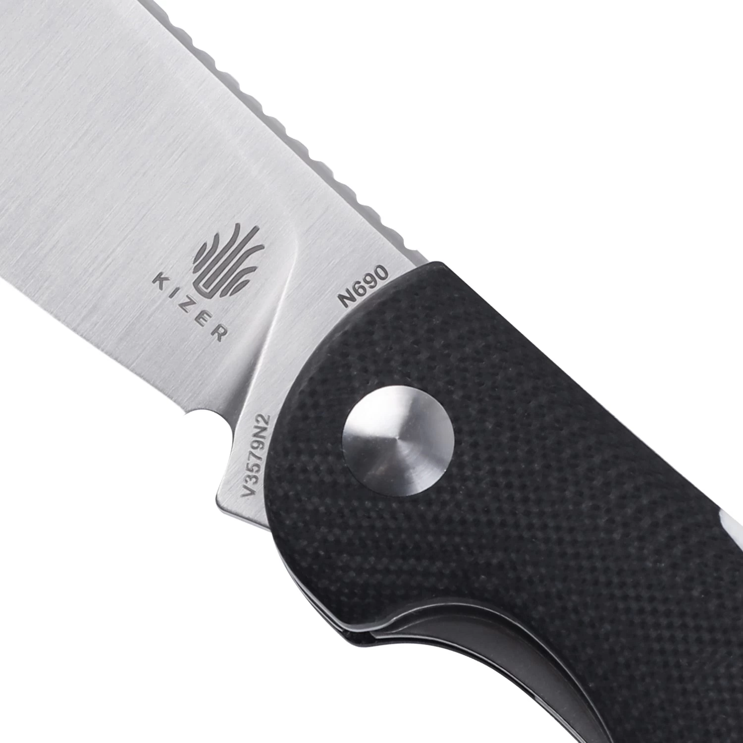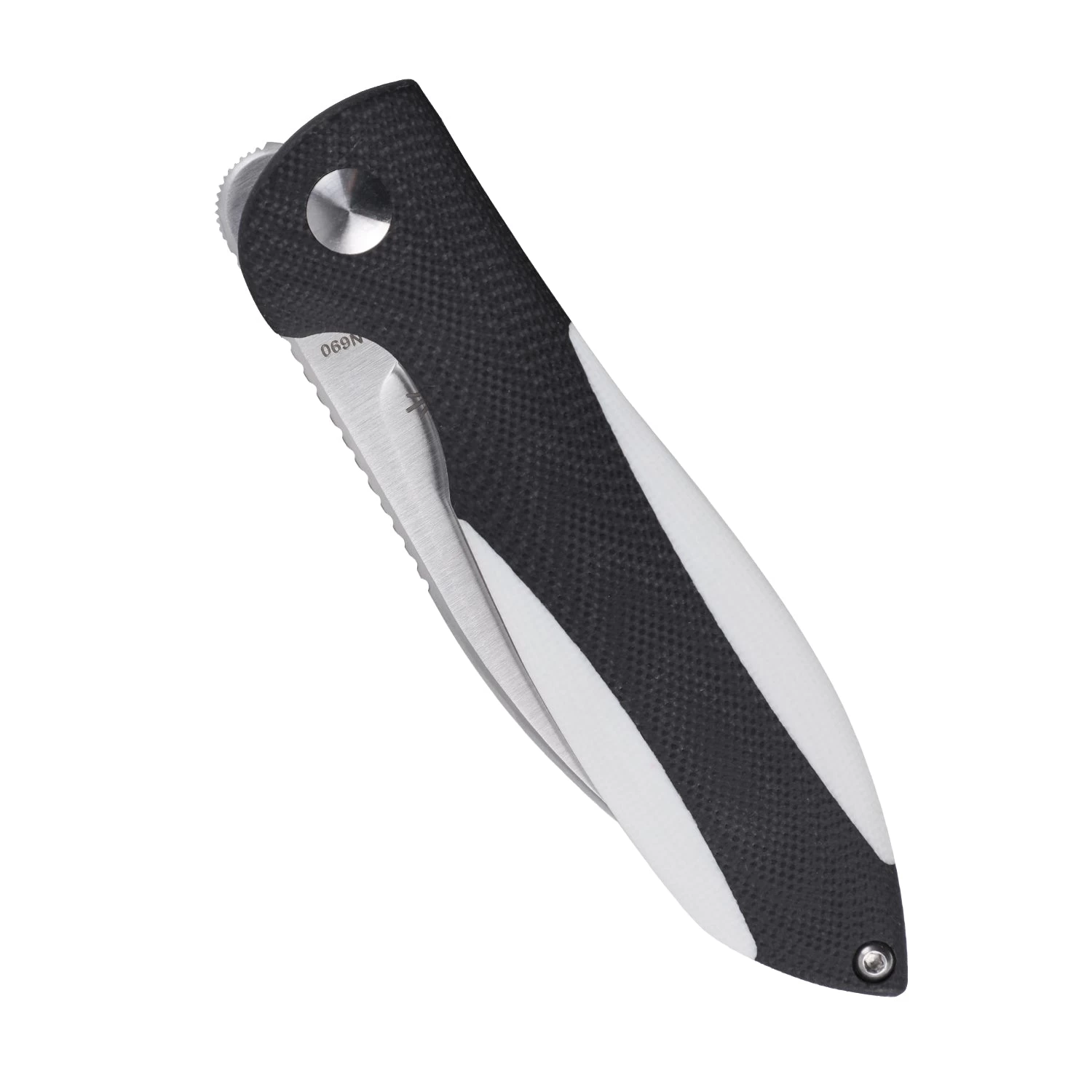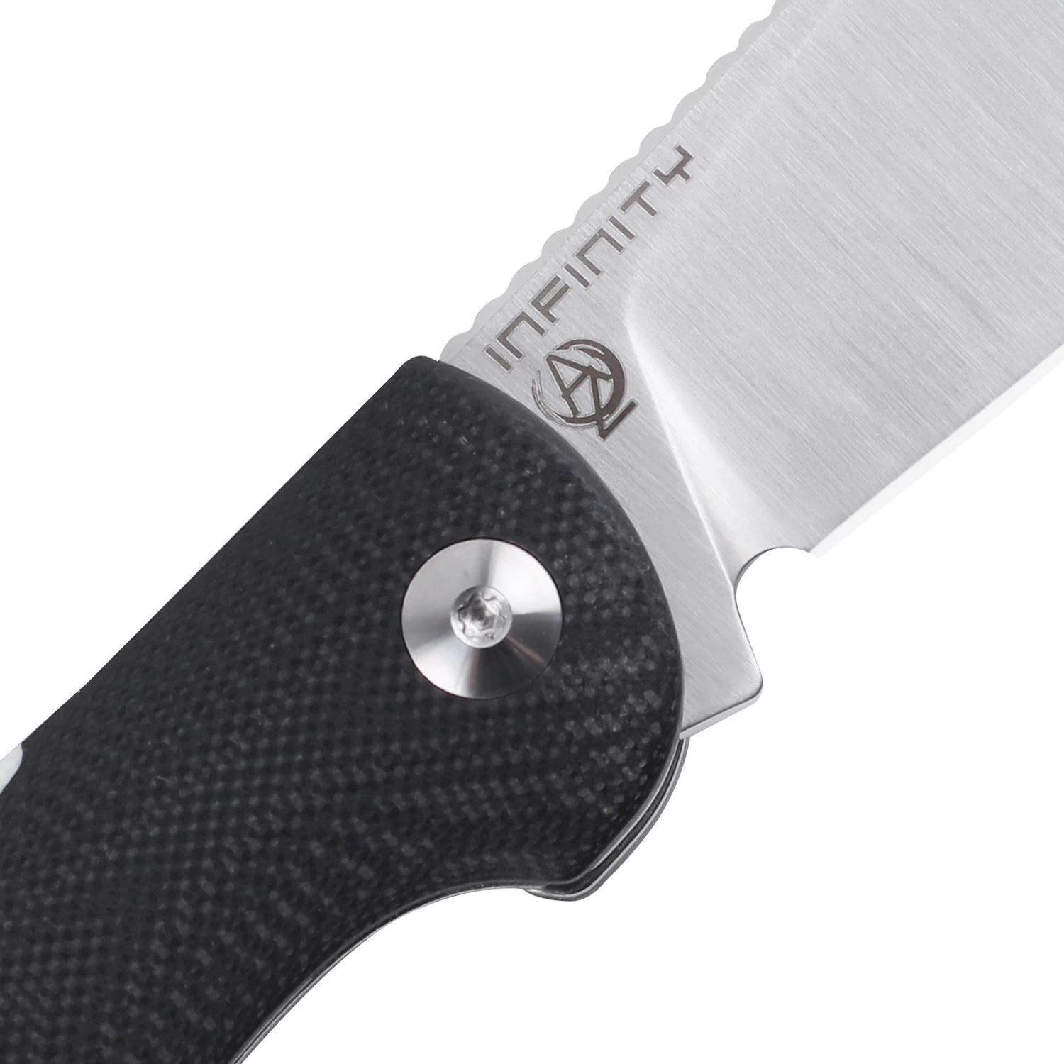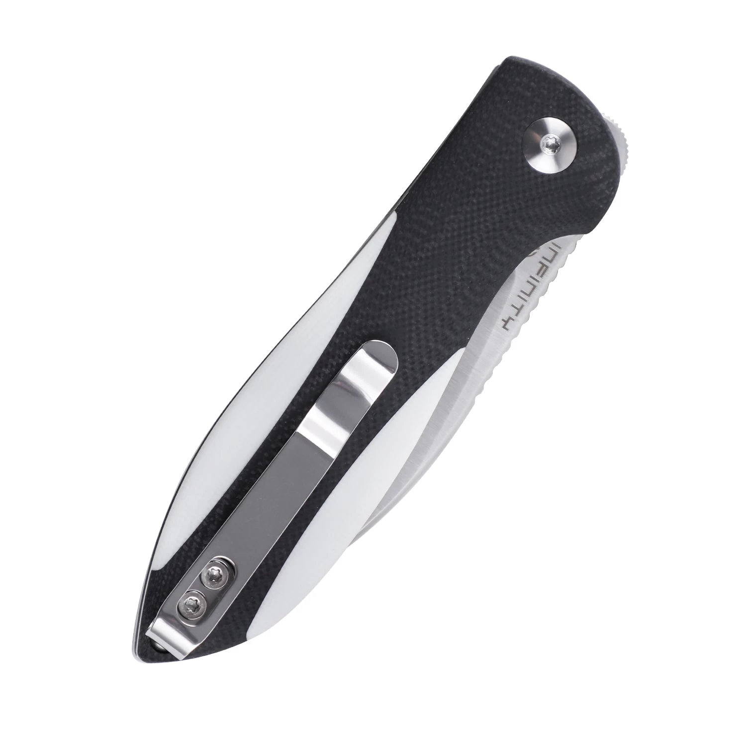 This Infinity model sports a black and white G-10 handle and a satin Bohler N690 stainless steel blade in a drop point shape.The Infinity knife utilizes a leaf-like drop point blade and a tall flat grind for excellent cutting and slicing performance. The front flipper is equipped with a ball bearing system to provide snappy opening action. The blade and the handle together were designed to form the mathematical infinity symbol. The contouring of the handle is comfortable to hold in the fingers