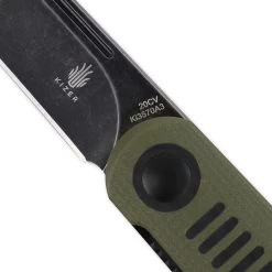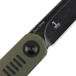 This Justin Lundquist designed De L’Orme is beautifully displaying a carbon fiber and black G-10 handle with a gray, stonewashed wharncliffe style blade. The liner lock is slim and subtle. The blade steel is CPM-20CV stainless and has a top-front flipper with slight jimping that makes opening this blade fun to fidget with.