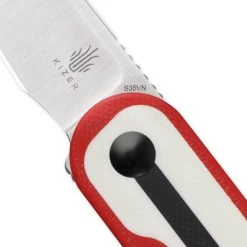 The Mini Bay is one of three detent action knives that Kizer has produced. This extremely compact knife features a subtle flipper opener with jimping, a handle with triple G-10 layering with red, white, and black, and a satin finished pocket clip with a lanyard hole cutout on the top of the clip. The finger choil on the blade keeps it from closing unwantedly. The Mini Bay blade is a wharncliffe made from S35VN steel with black coated finish.